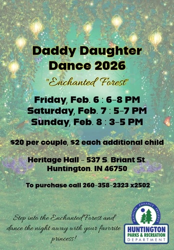 The 2026 Daddy Daughter Dance "Enchanted Forest" will take place on three different dates. Tickets are available by contacting the Huntington Parks & Recreation Dept at 260-358-2323 ext 2502.