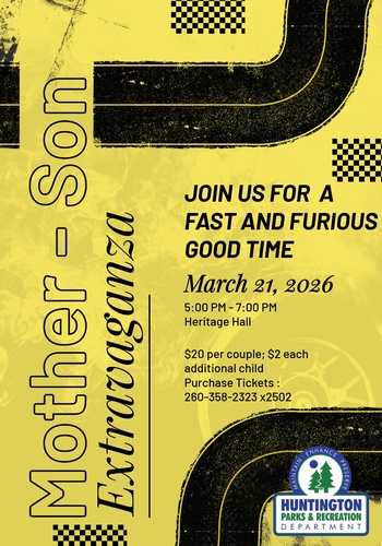The Mother Son Extravaganza will take place on Saturday, March 21, 2026 from 5-7pm. Tickets are available by calling the Huntington Parks & Recreation Dept. at 260-358-2323 ext. 2502. Join in the fun for a 'Fast & Furious good time'. Tickets are $20 per couple with $2 for each additional child. The event takes place at Heritage Hall, 537 S. Briant St.