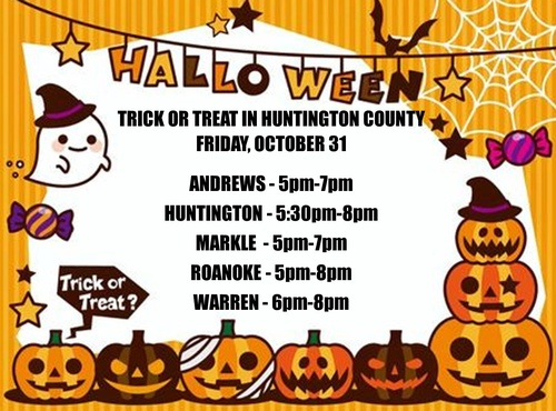 Trick or Treat in Huntington County this October 31 during the following hours for each town.